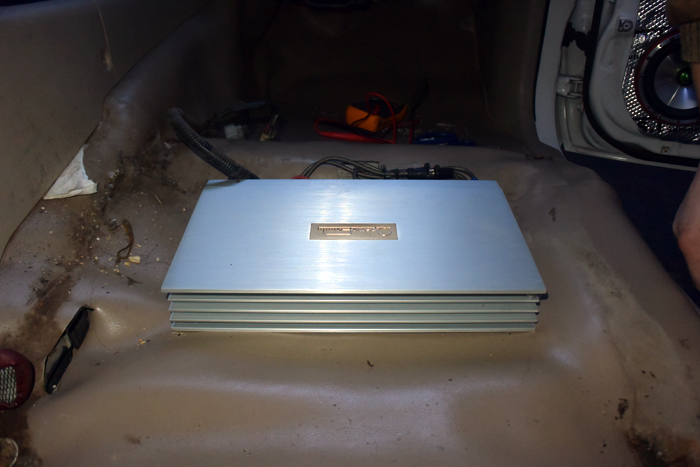 歌剧世家VA400.4功放选择安装在副驾驶座位下,节省车内空间,调试也方便。