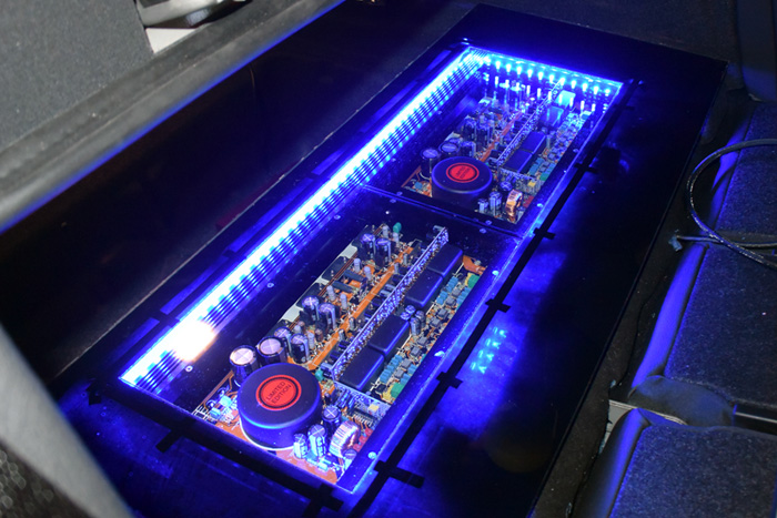 两台卡莱维尔帝黑金梦幻四功放安装在尾箱。