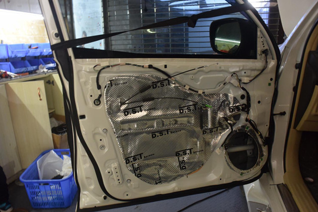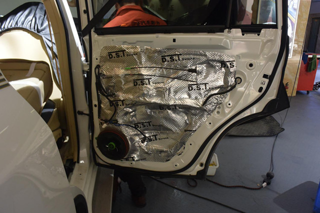 车门第一层隔音使用DST贴满,这样处理能有效阻止门板和外层钢板之间的共振噪音,对于止震隔热有着显著的作用。