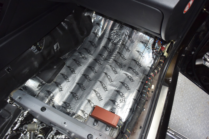 正负驾地板使用CSH小炸弹和CSH珍珠棉的组合,CSH小炸弹是一种多层减振材料,包含丁基橡胶聚合物层、铝箔外层。材料需安装于干燥的油漆表面,复杂表层同样适用。安装前应移除抗粘膜,从材料一边向另一边逐渐黏贴,然后用滚轮压实,避免产生气泡。